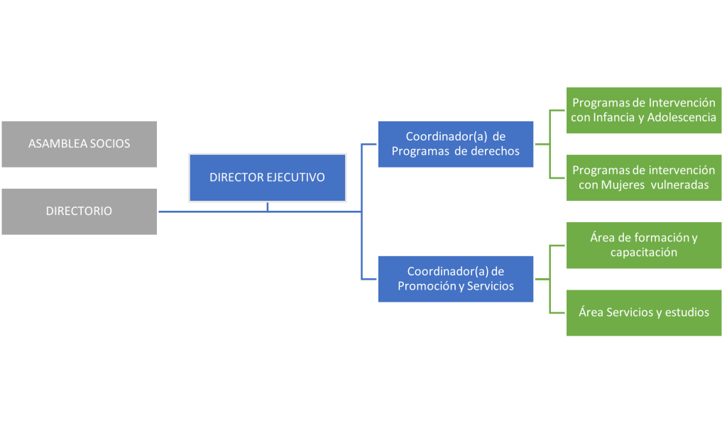 Considerando que el objetivo de la Asociación “la promoción y defensa de los derechos de las personas, familias, grupos y comunidades que viven en condiciones de pobreza y/o marginalidad y especialmente la promoción y defensa de los derechos vulnerados de la infancia, adolescencia, sus familias, que pertenezcan o no a pueblos originarios, y tenga o no capacidades distintas”, promueve diversas líneas de acción, es que se establecen dos áreas de acción que contarán con sus respectivos coordinadores, quienes serán los responsables del funcionamiento de los diferentes programas o servicios que se ejecuten en el proceso, estos coordinadores rendirán informes al Secretario/a Ejecutivo, quién reportará al Directorio de la ONG.